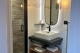 Chambre pour trois personnes avec vue mer ou vue cour selon disponibilités avec un lit double de 150x190 et un lit de 90x190, WiFi gratuit, TV écran plat, salle de bains avec baignoire, WC séparés.